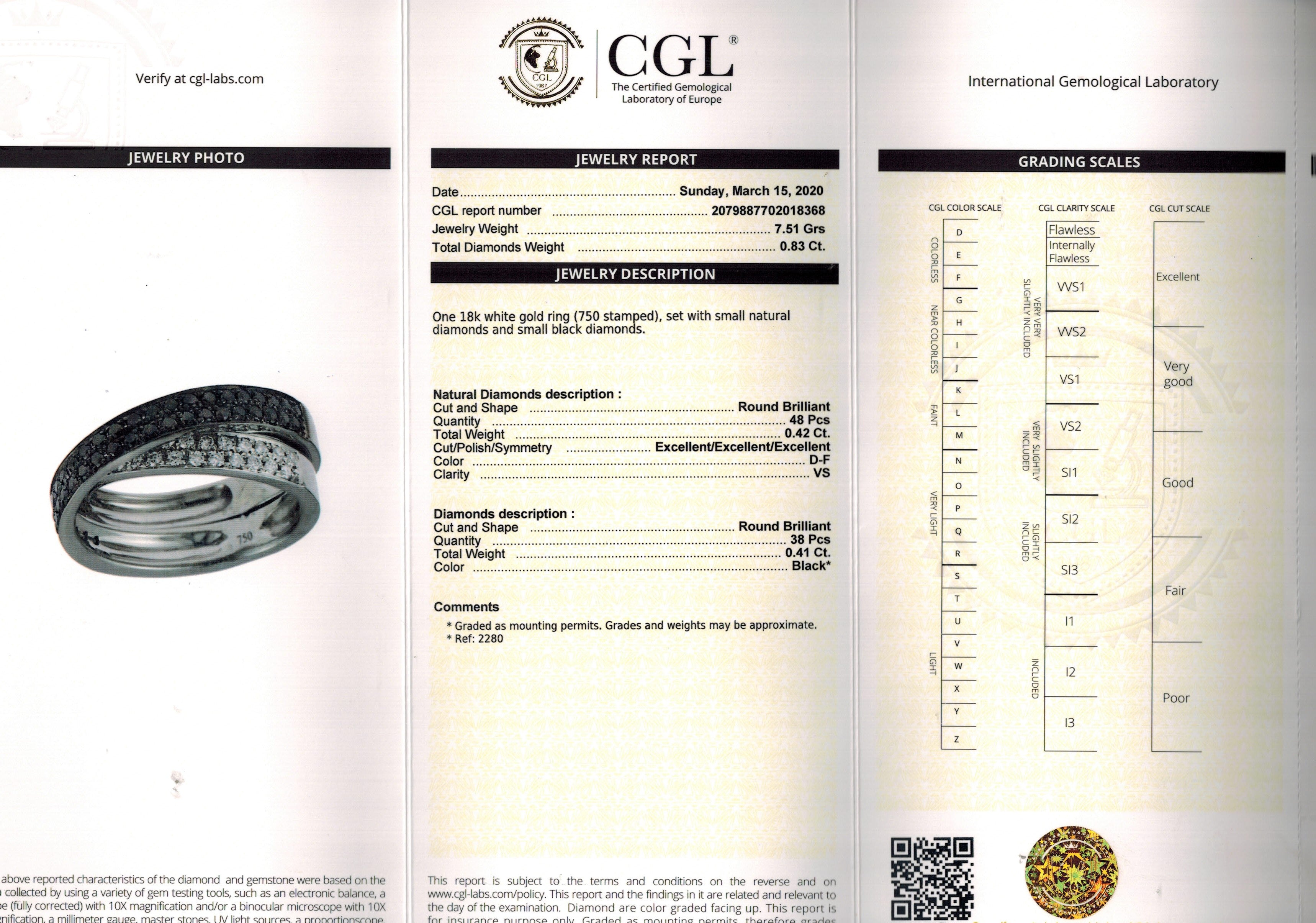 A charming black and white diamond pave crossover ring. This sensational ring features round brilliant cut black and white diamonds in a contemporary crossover design. Set in a beautiful 18K white gold, this elegant band is sure to be loved by all who see it.
