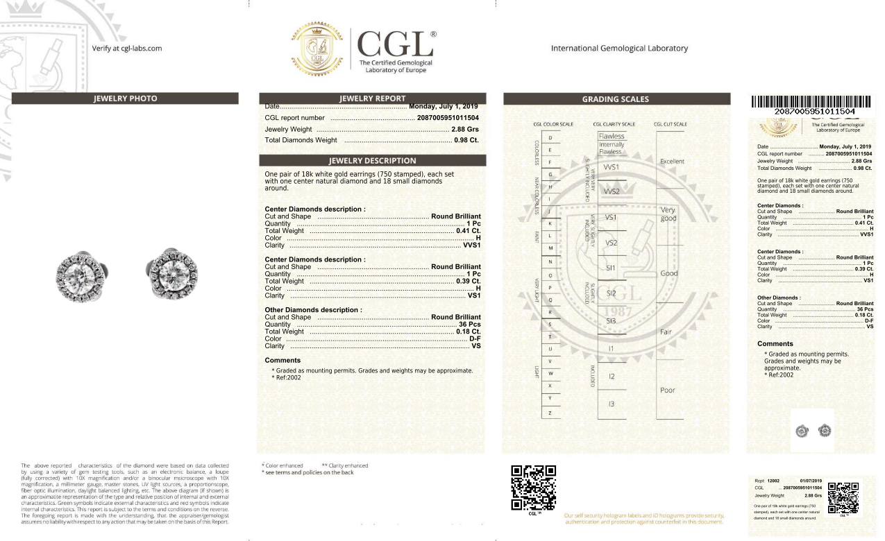 These diamond stud earrings are magnificent. Set in 18K white gold, each earring features a round brilliant white diamond. An additional feature to these studs, is the paved halo surrounding the diamond, adding sparkle and shine. Adding a touch of unique style, these earrings are secured with a flower-shaped backing. These earrings are sure to be loved by all who see them and make for a wonderful gift.