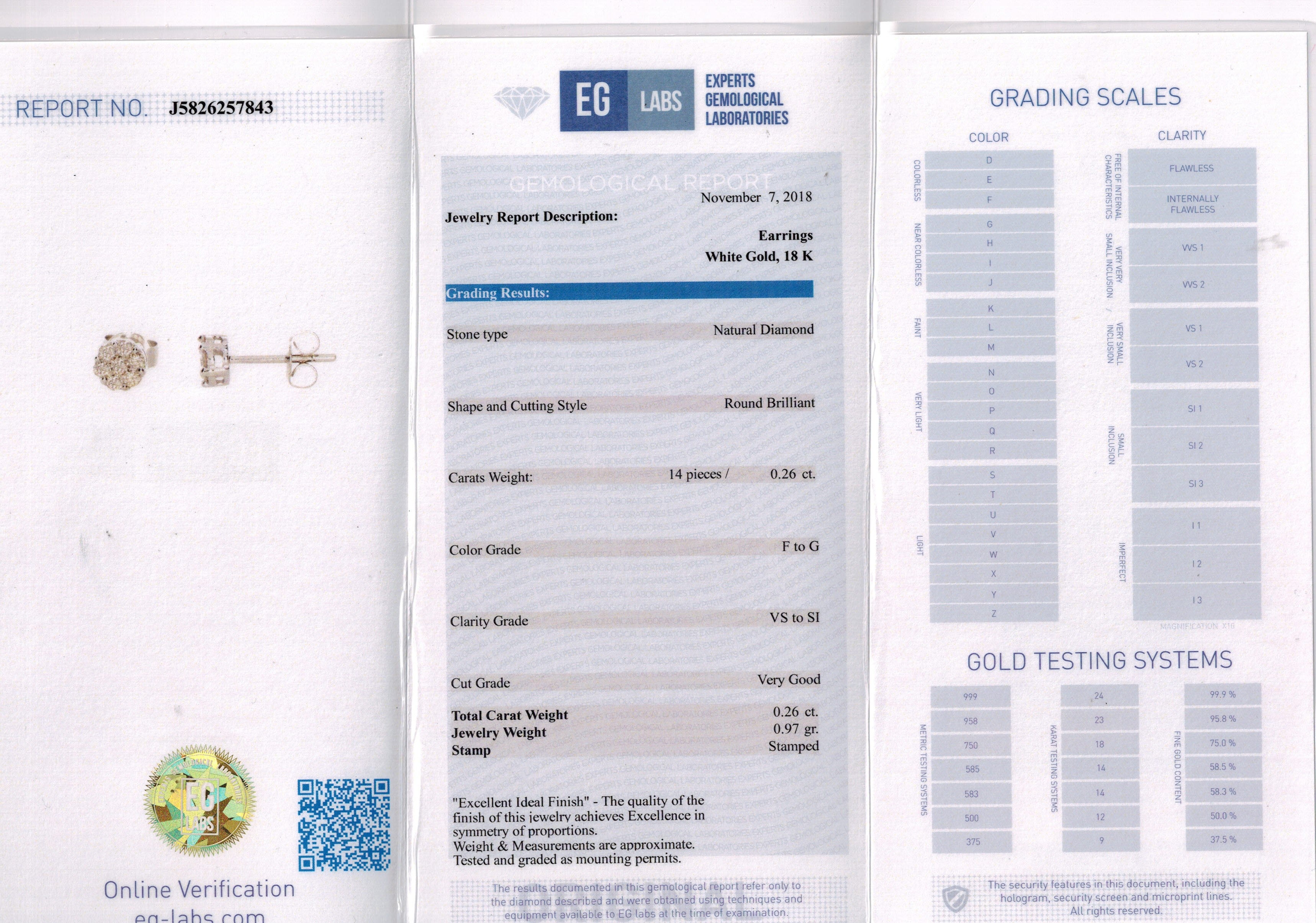 Classic and elegant, these diamond stud earrings are a stunning jewelry staple. Created in 18K white gold, these earrings hold 14 round brilliant white diamonds. Fashionably crafted, each earring features a glistening flower-shaped composite of shimmering brilliant cut round diamonds that catches the eye and are secured with friction backs. These earrings make for pretty gift, are are sure to be loved by all who see them.
