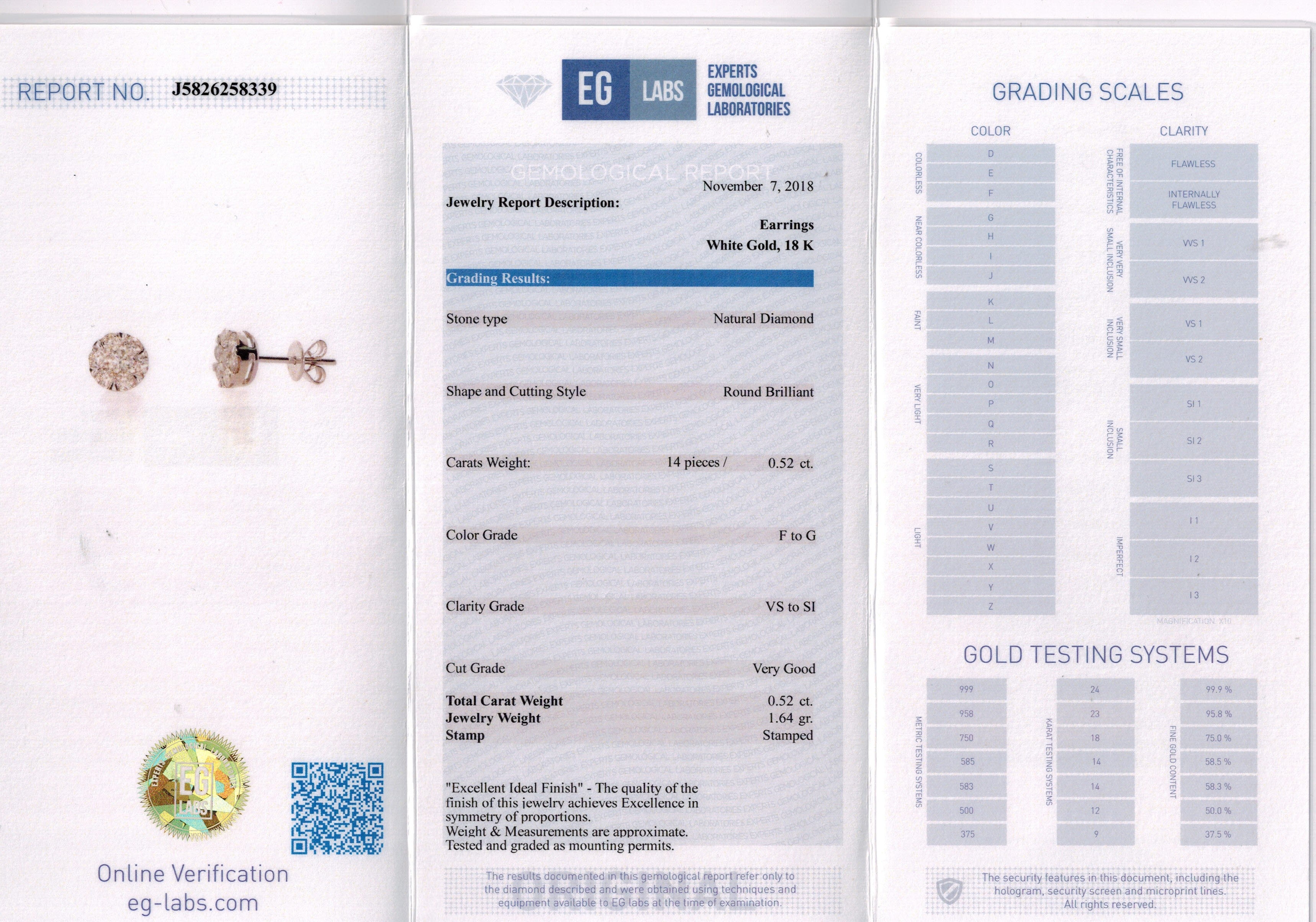 Classic and elegant, these diamond stud earrings are a stunning jewelry staple. Created in 18K white gold, these earrings hold 14 round brilliant white diamonds. Fashionably crafted, each earring features a glistening flower-shaped composite of shimmering brilliant cut round diamonds that catches the eye and are secured with friction backs. These earrings make for pretty gift, are are sure to be loved by all who see them.