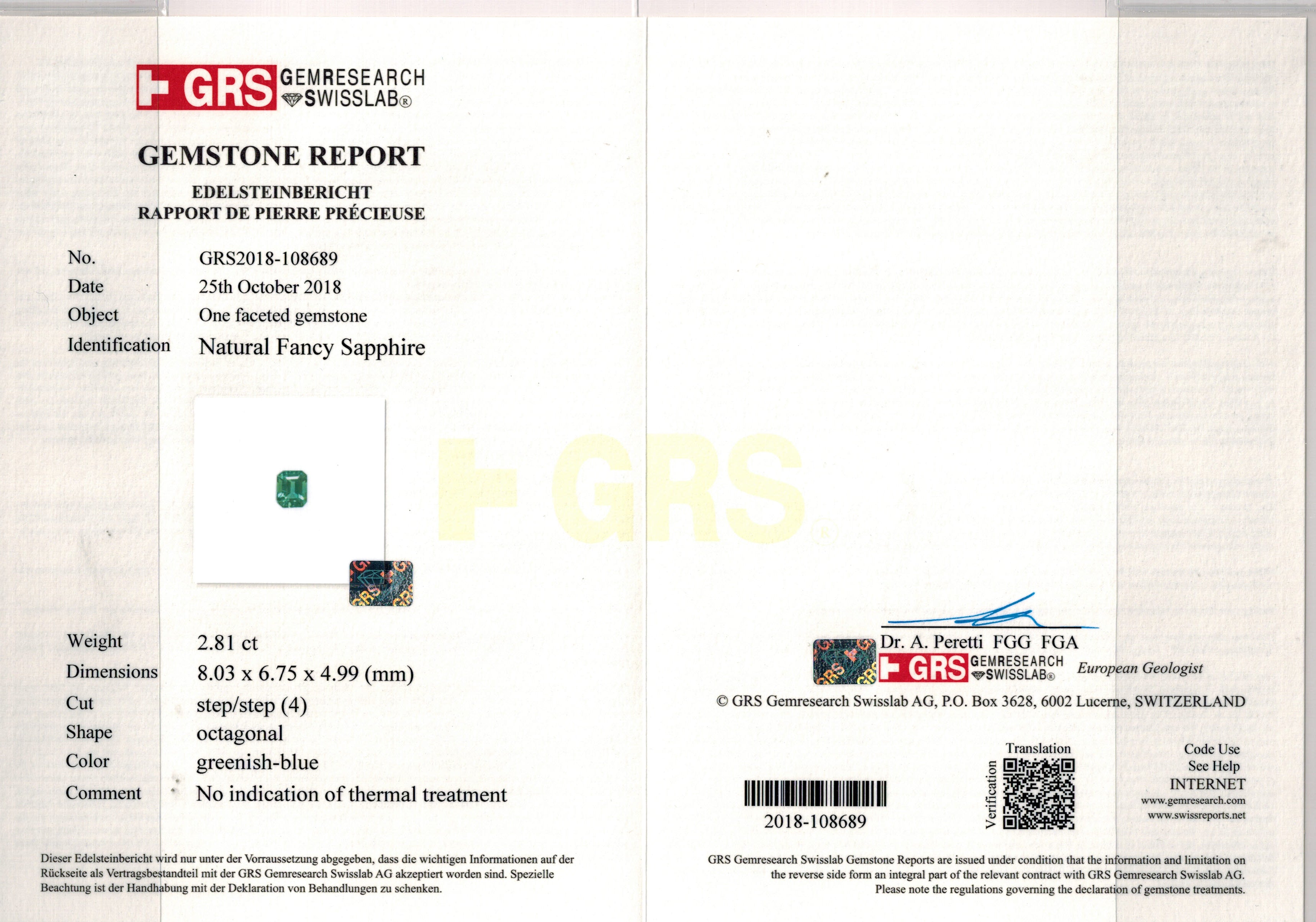Octagonal Cut Natural Fancy Green Sapphire Ring - 3.1 Carat