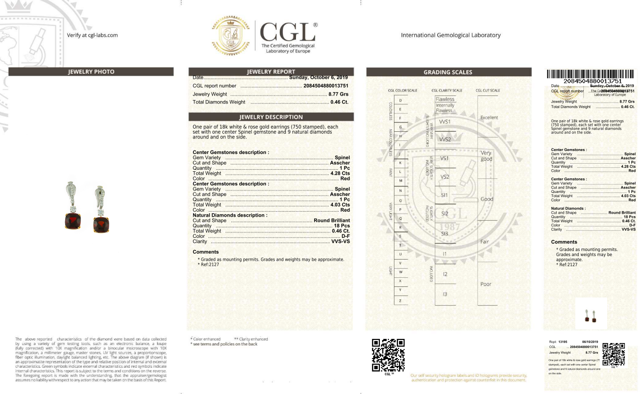 These magnificent asscher cut red spinel drop earrings, resembles royalty. Elegant and stylish, these spinel earrings are set in 18K white and rose gold, and are adorned with two asscher cut red spinel gems, as the center stones. They are placed in a rose gold basket, which complements the red of the spinel and allowing it to really glisten and sparkle. The dangle, set in white gold, consists of a shining round brilliant diamond, adding that contrast of colors to the red spinel, and the finishing touch is the array of sparkling white diamonds paved along the center of the English Lock. These earrings are sure to be loved by all who see them, and make for a beautiful gift.