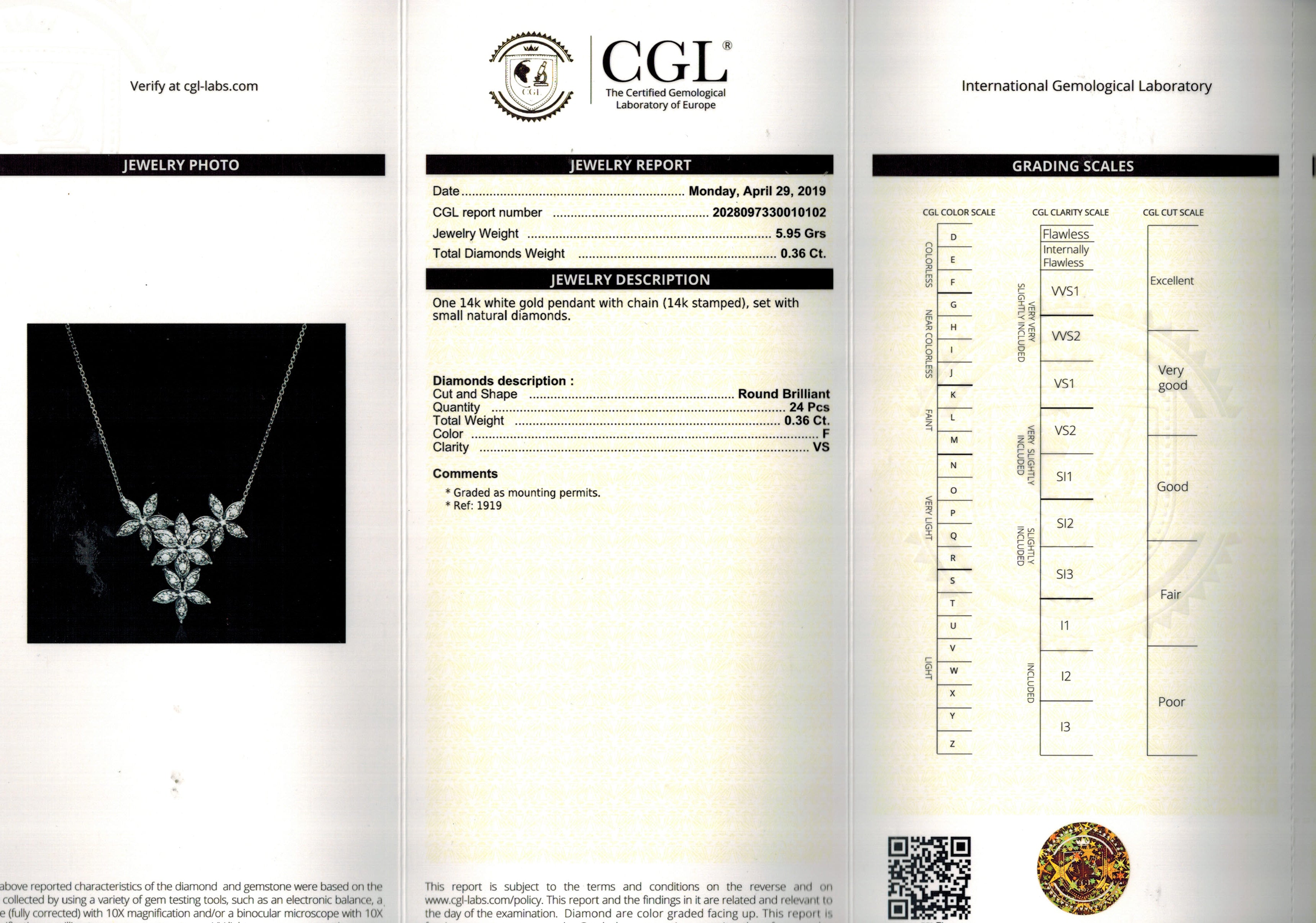 This sparkling floral necklace, is a classic. Elegant and stylish, this floral white diamond pendant is set in 14K white gold, and features four embellished flowers that hang, from smallest to largest creating a seamless Y shape. The pendant hangs from a white gold link chain and is attached by two jump links placed on the tips of the Y. This pendant is sure to be loved by all who see it and makes for a beautiful gift.