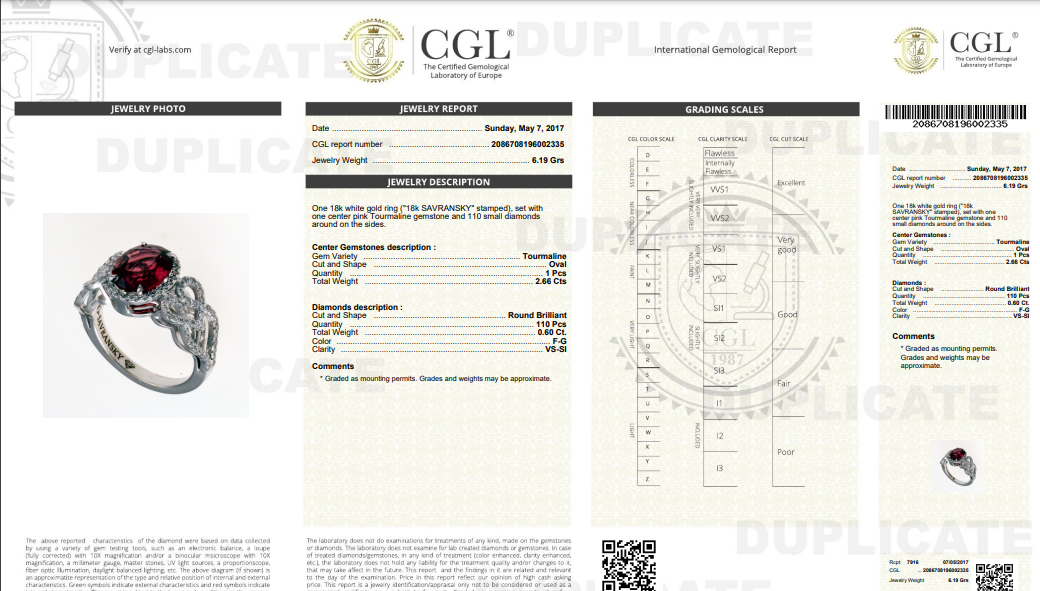 With your purchase, you will always receive a lifetime warranty, two Gemological Certificates- one for the center diamond as well as one for the finished piece, and an APPRAISAL certificate from Savransky Private Jeweler.