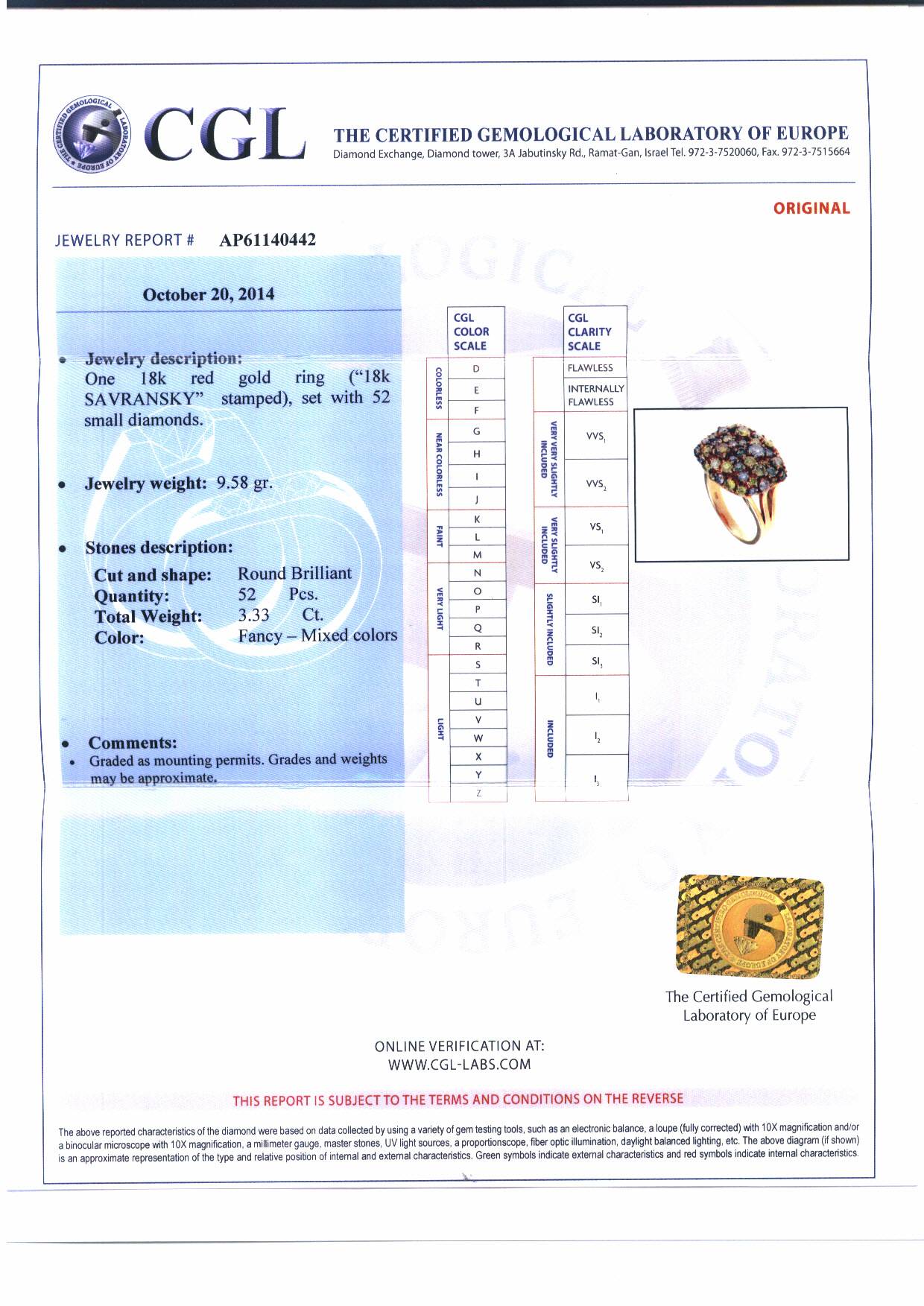 With your purchase, you will always receive a lifetime warranty, two Gemological Certificates- one for the center diamond as well as one for the finished piece, and an APPRAISAL certificate from Savransky Private Jeweler.