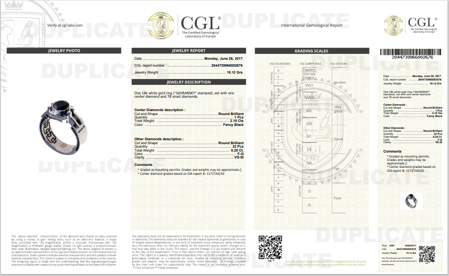 With your purchase, you will always receive a lifetime warranty, two Gemological Certificates- one for the center diamond as well as one for the finished piece, and an APPRAISAL certificate from Savransky Private Jeweler.