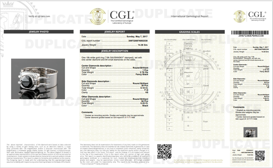 With your purchase, you will always receive a lifetime warranty, two Gemological Certificates- one for the center diamond as well as one for the finished piece, and an APPRAISAL certificate from Savransky Private Jeweler.