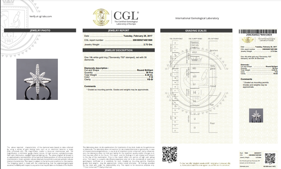 With your purchase, you will always receive a lifetime warranty, two Gemological Certificates- one for the center diamond as well as one for the finished piece, and an APPRAISAL certificate from Savransky Private Jeweler.