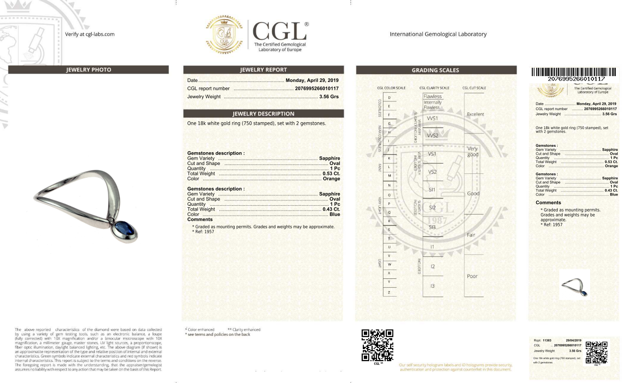 Young and fresh, this 18K white gold chevron style ring is handcrafted and ingeniusly designed. This unique design displays a white gold chevron-shaped ring with a two-sided oval-shaped dangle at the tip featuring on one side a blue sapphire and on the other side an orange one. This ring is sure to be loved by all who see it, and makes for a perfect gift.