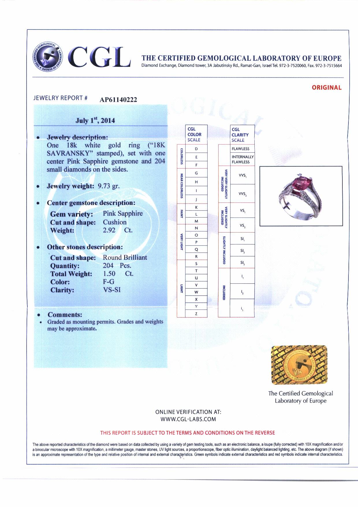 With your purchase, you will always receive a lifetime warranty, two Gemological Certificates- one for the center diamond as well as one for the finished piece, and an APPRAISAL certificate from Savransky Private Jeweler.