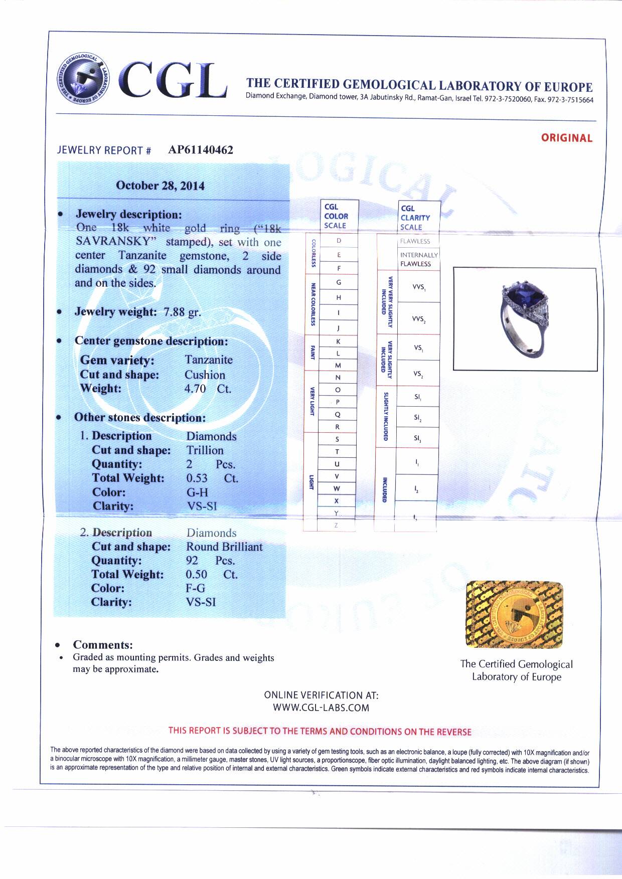 With your purchase, you will always receive a lifetime warranty, two Gemological Certificates- one for the center diamond as well as one for the finished piece, and an APPRAISAL certificate from Savransky Private Jeweler.