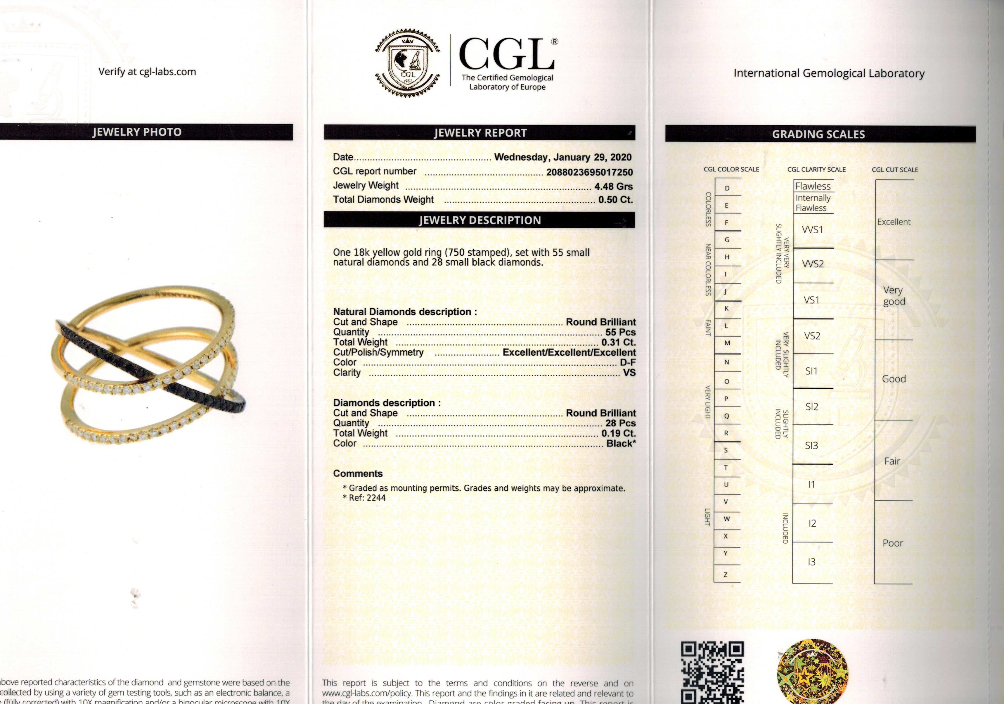 Raise the fashion bar with this stunning yellow gold, black and white diamond ring. Crafted in 18K yellow gold, this fashionable piece showcases three bold ribbons, two shimmering in white diamonds and another in black diamonds crossing over the two. Captivating with sparkling diamonds and a bright polished shine, this ring fits any occasion with ease.