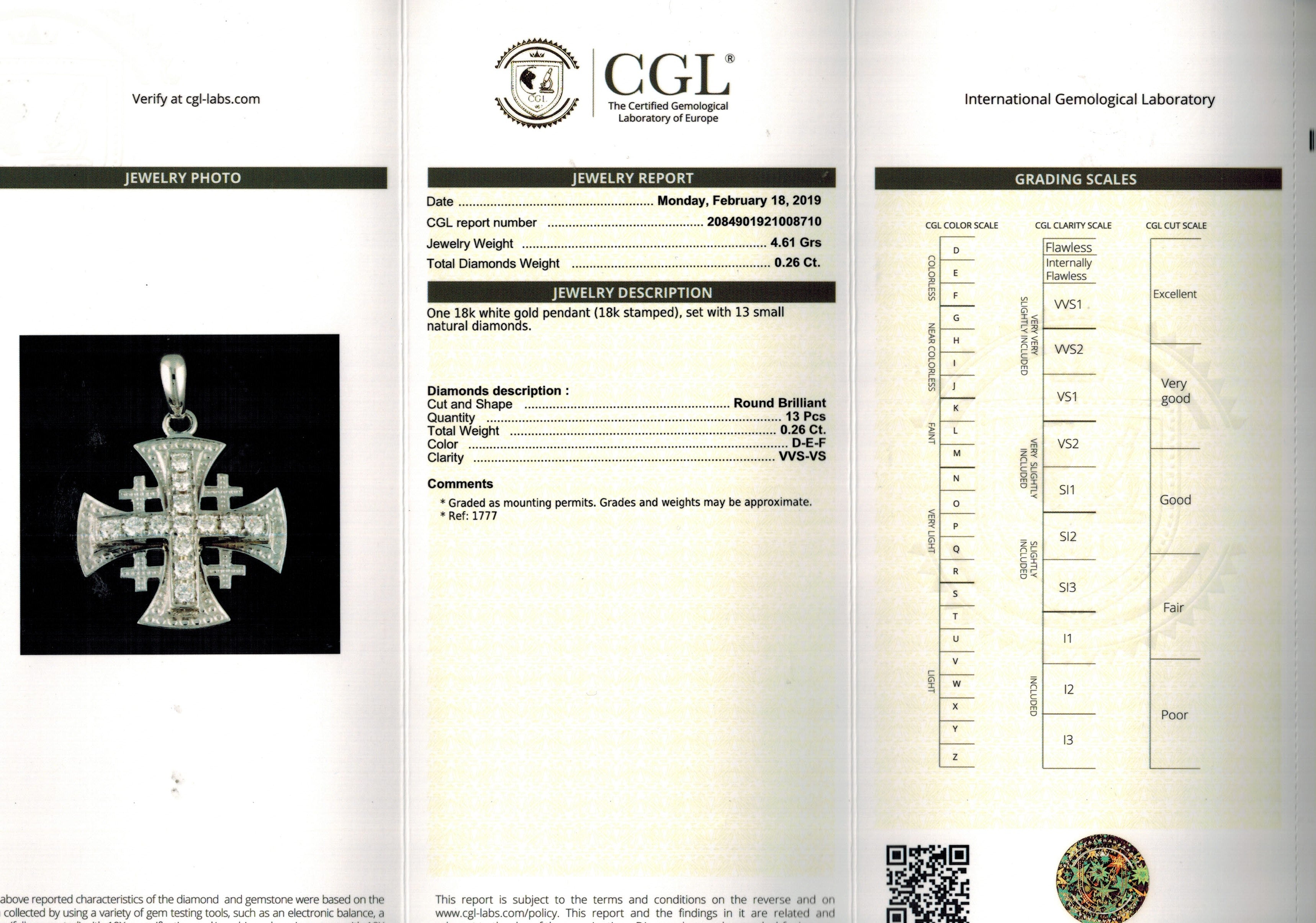 Celebrate your faith with this beautiful Jerusalem cross pendant. Fashioned in 18K white gold, this design features a Jerusalem cross shape pendant - all adorned with shimmering diamonds. The symbolism of the five-fold cross is variously given as the Five Wounds of Christ, Christ and the four evangelists, or Christ and the four quarters of the world. Radiant with 0.26 ct. t.w. of diamonds and a bright polished shine, this pendant is the perfect gift for your loved one.