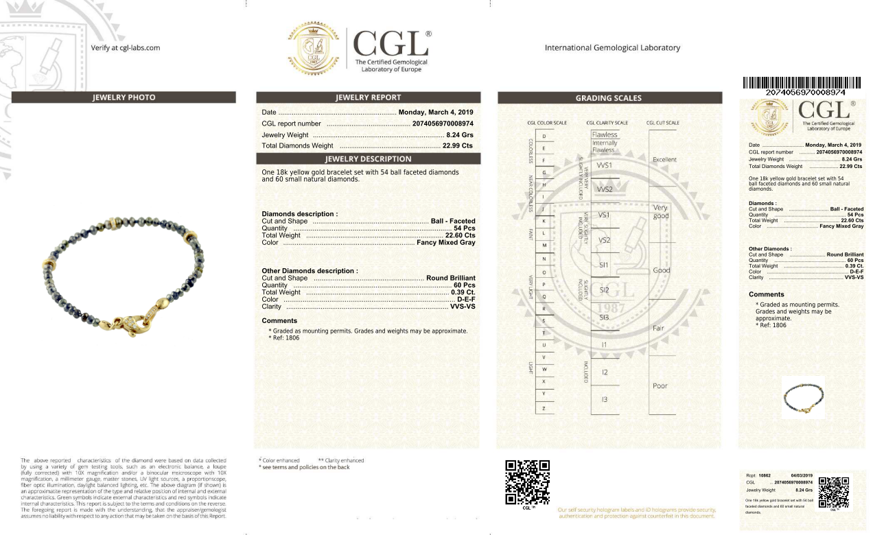 This attractive fancy grey diamond mixed beaded bracelet easily becomes a jewelry staple. Crafted in 18K yellow gold, this beaded bracelet features ball-faceted fancy mixed fancy grey diamonds strung along the necklace. Adding sparkle, are 3 yellow gold rings that are embedded with white diamonds, placed at intervals across the bracelet chain. Clasping the bracelet closed, is a fish lock that is paved with white diamonds. This bracelet is sure to be adored by all who see it and makes for a lovely gift.