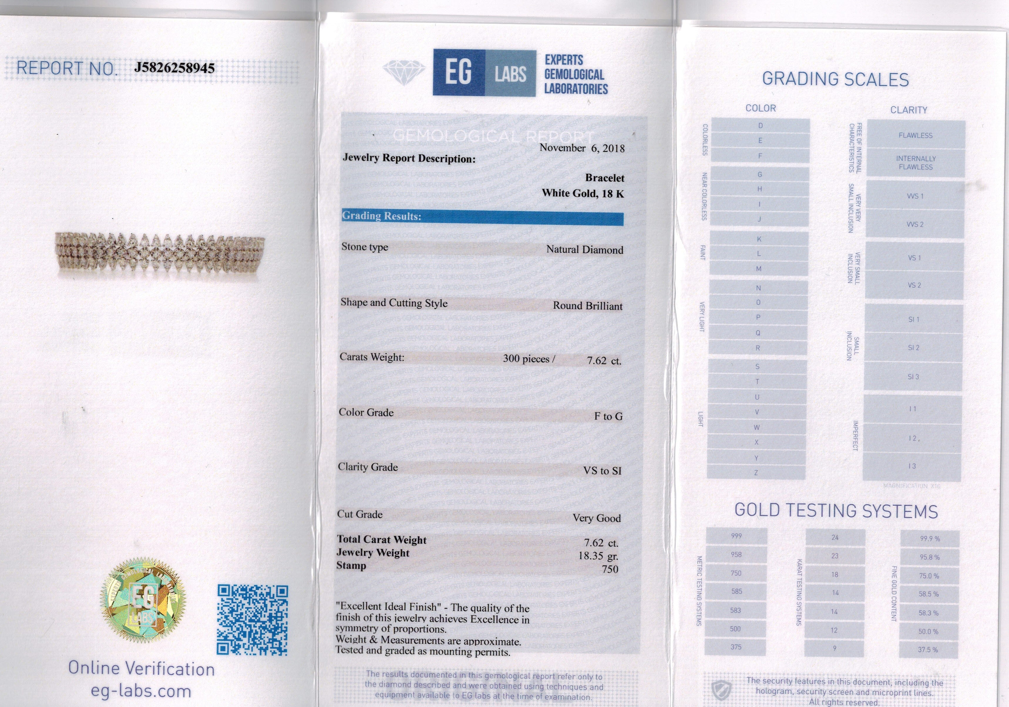 The tennis bracelet is an iconic piece and has become a sparkling jewelry staple. Crafted in 18K white gold, this tennis bracelet features over 7.5 carats of scintillating diamonds. The bracelet is designed with a center row of round white diamonds, placed in four prong settings. Gracing the sides of the center row, are two additional rows of smaller round diamonds, creating a triangle shape for each diamond cluster, giving this classic piece, a unique and chic touch. This extravagant piece is sure to be loved by all who see it and makes for a very special gift.